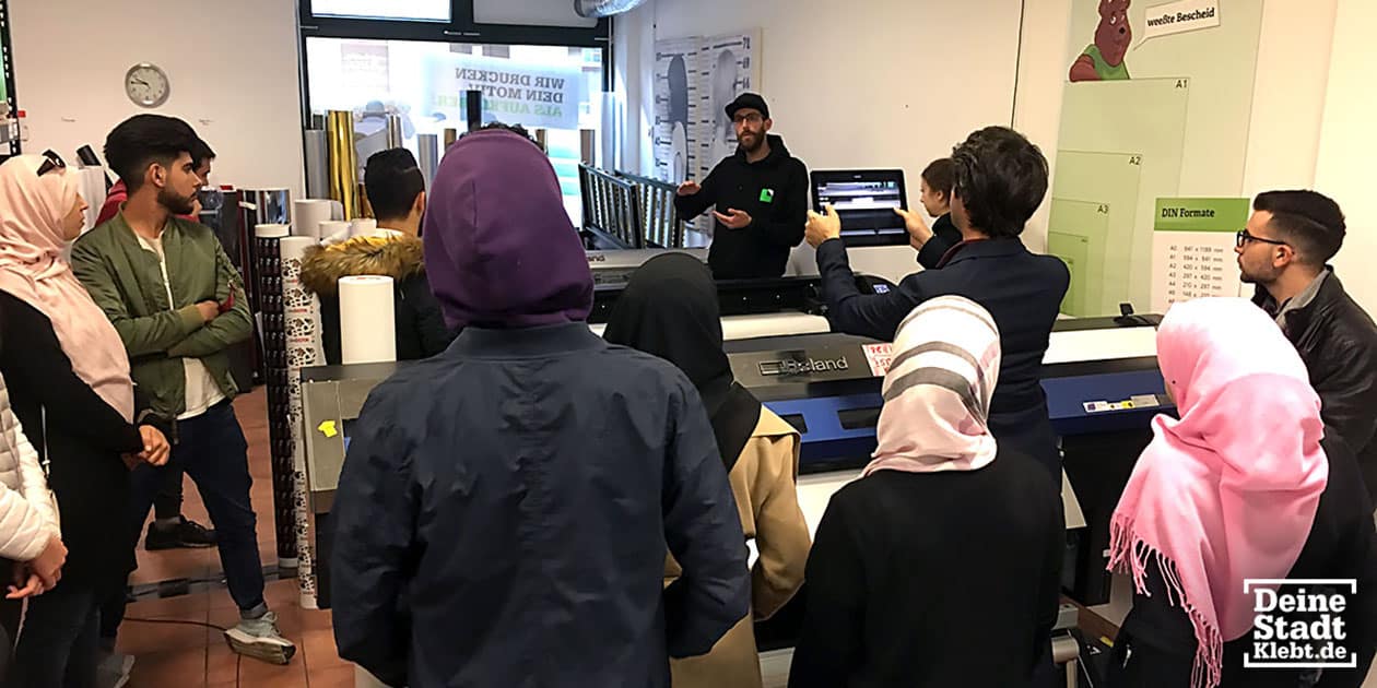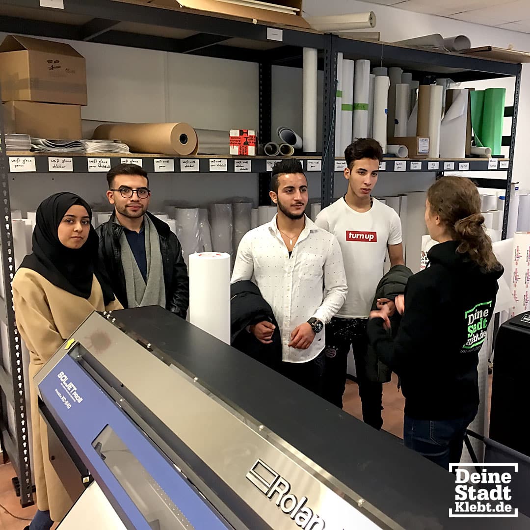 Die Schüler/-innen in den Willkommensklassen der Oberstufenzentren in Berlin im Alter zwischen 16 und 24 Jahren hatten im Rahmen des Projekts die Möglichkeit die Produktionsräume von DeineStadtKlebt zu begehen. Sie lernten somit die praktischen Lernorte der dualen Ausbildungsberufe zum Mediengestalter/-in Digital und Print sowie zum Medientechnologe/-technologin Druck zur Berufsorientierung kennen.