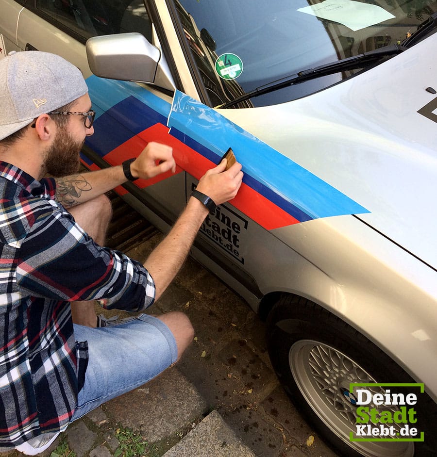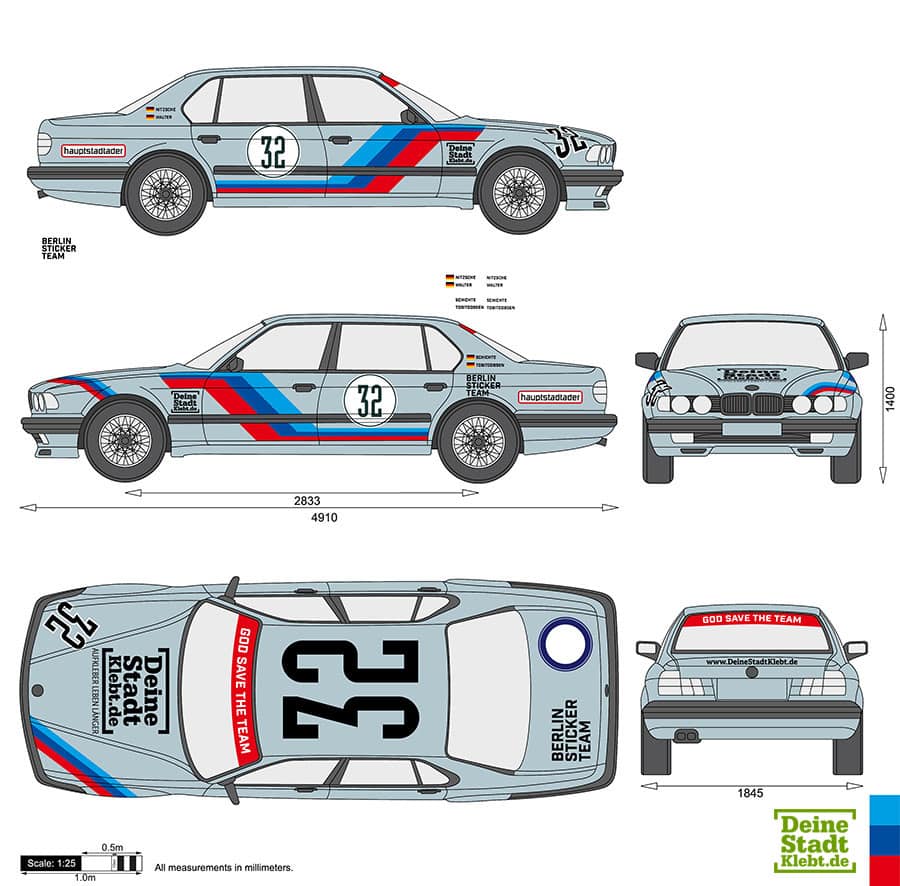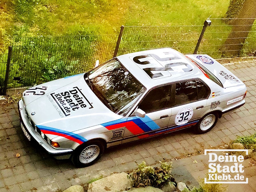 Also wurde unser Azubi Tobi mit einer Gestaltung im Stil eines alten BMW-Rallye-Modells beauftragt und konnte seiner Kreativität freien Lauf lassen. Insgesamt gibt es in Deutschland nur noch 644 zugelassene Fahrzeuge des Modells BMW 750i; mit unserer Gestaltung wird er gleich noch exklusiver.