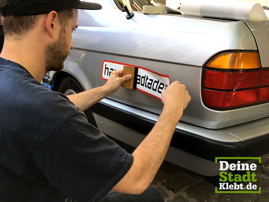 Jeder Aufkleber muss Zentimeter für Zentimeter vorsichtig angebracht werden um kleine Bläschen zu vermeiden. Insgesamt waren vier Kollegen ca. zehn Stunden mit der Verklebung beschäftigt. Das hat sich auf jeden Fall gelohnt – hoffentlich sieht das auch die Rallye-Jury so 😉