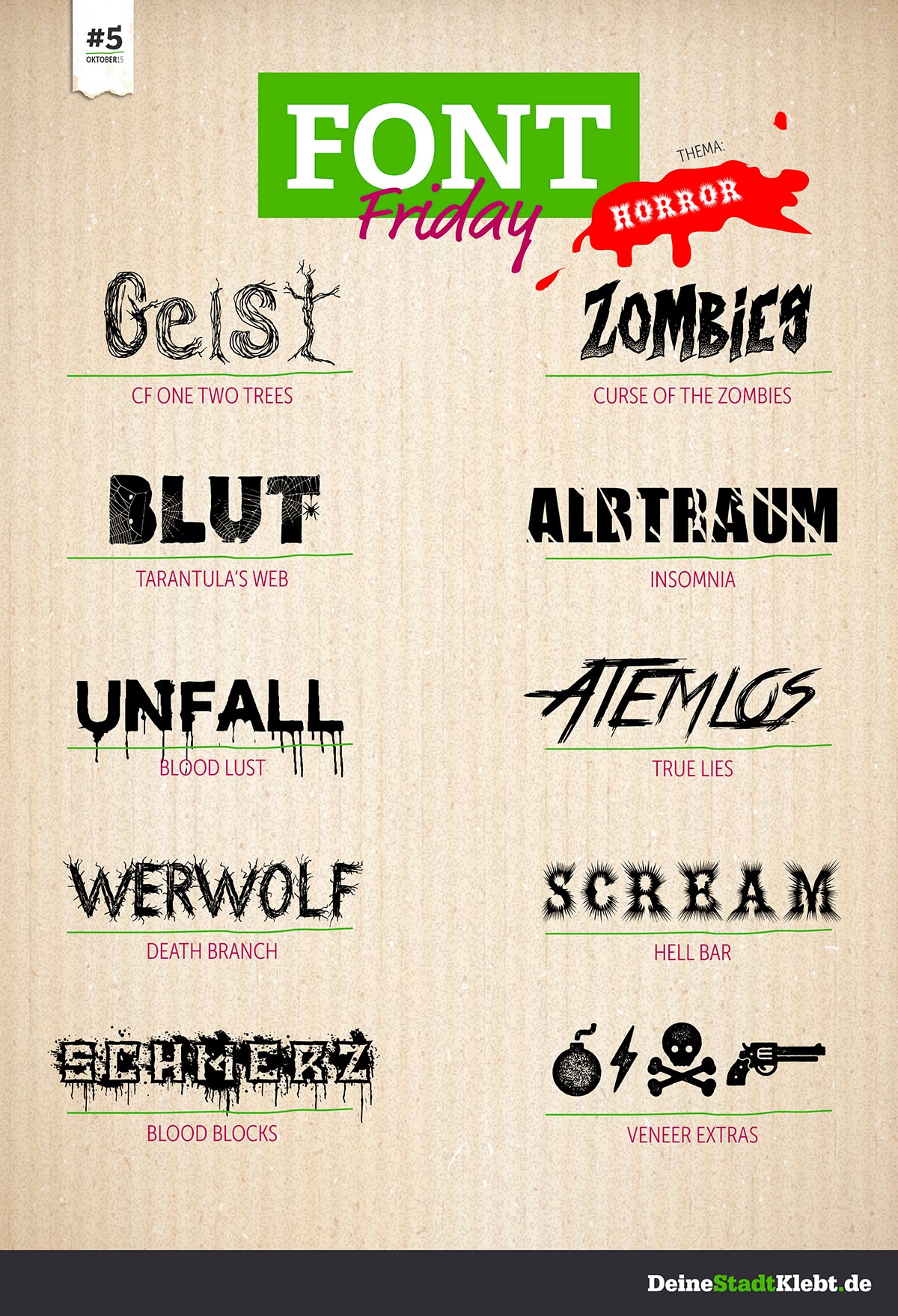 Diesen Freitag gibt es von uns wieder ein neues Freebie: Halloween steht vor der Tür und damit du die Einladungen zu deiner Party schaurig-schön gestalten kannst, haben wir dir wieder bei DaFont und FontSquirrel einige Schriften zusammengesammelt. Machen sich auch auf Stickern ganz hervorragend 😉