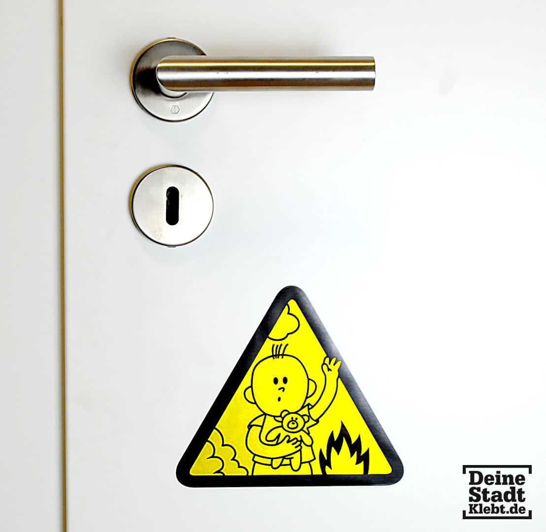 Aufgeklebter reflektierender Aufkleber in Form eines dreieckigen Warnsymbols als Hinweis an einer KinderzimmertürEs ist zwar nur ein Aufkleber, doch er kann im Brandfall Kinderleben retten: Denn ein Sticker aus stark reflektierender Folie an der Kinderzimmertür hilft den Rettungskräften, die Sprösslinge in einer verrauchten Wohnung ausfindig zu machen.