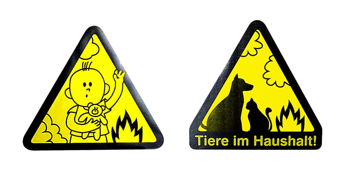 Im Brandfall geraten Kinder meist in Panik und verstecken sich aus Angst meist irgendwo im Kinderzimmer, unter dem Bett oder im Schrank. Sie wiegen sich dort in Sicherheit – ein gefährlicher Trugschluss. In welchem Raum sich ein Kind möglicherweise bei einem Brand aufhält, ist für die Rettungskräfte nur sehr schwer zu erkennen und wird bei zunehmender Rauchentwicklung umso schwieriger. Der auffällige, dreieckige Aufkleber in gelber Farbe und in Form eines Warnsymbols reflektiert das Licht und wird somit von den Rettungskräften besser gesehen.