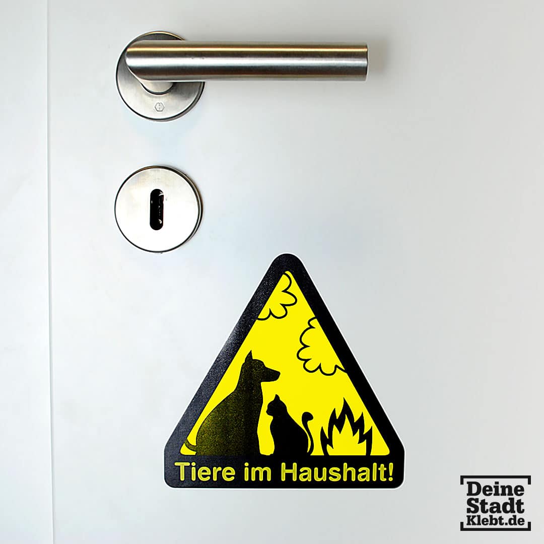 Reflektierender Aufkleber mit der Aufschrift: Tiere im Haushalt in Form eines dreieckigen Warnsymbols als Hinweis an einer HaustürZusätzlich zu den Kinderfinder-Stickern haben wir bei uns noch ein weiteres Motiv entworfen, denn natürlich ist uns im Brandfall wichtig, dass auch die Tiere schnellstmöglich gerettet werden. Daher gibt’s bei uns auch zusätzlich die Aufkleber mit der Aufschrift: „Tiere im Haushalt“.