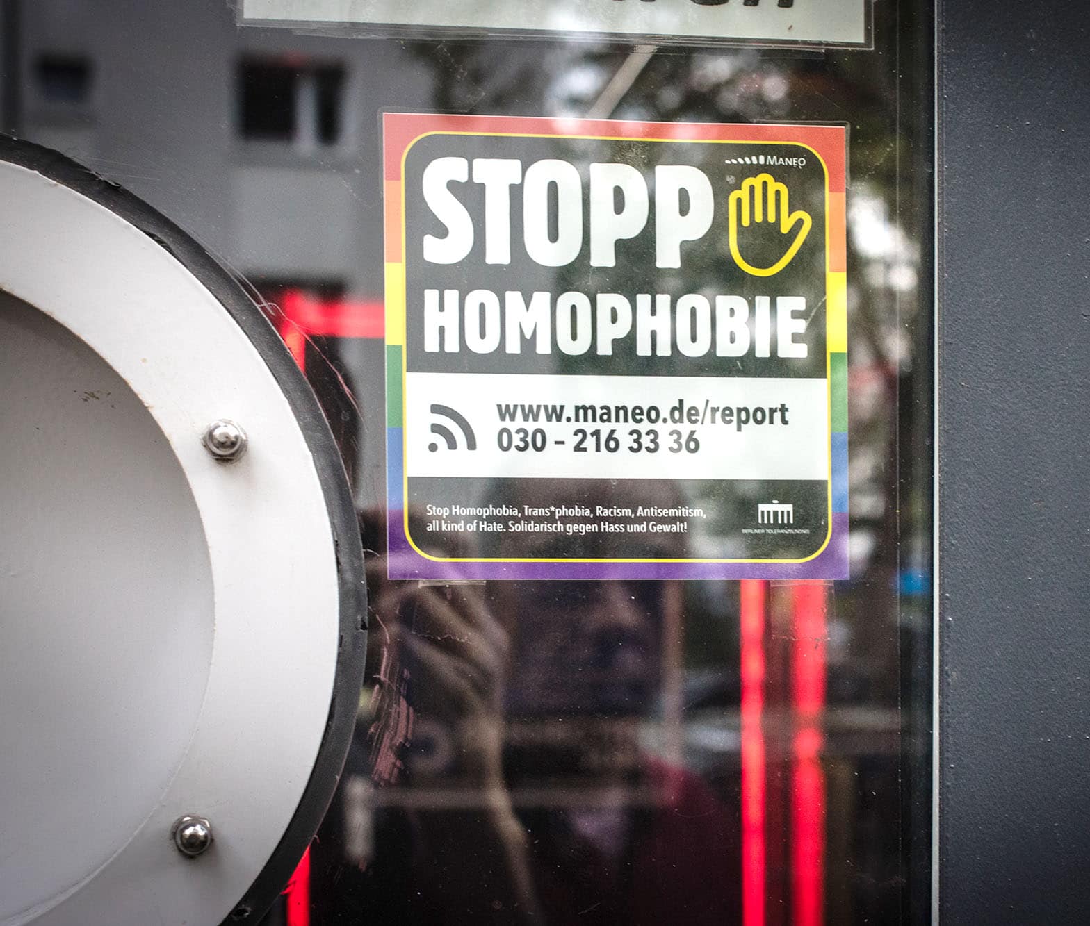 Läuft man heute durch die Fußgängerzonen der Stadt, schaut man kaum in ein Fenster ohne Klebefolien. Schaufensteraufkleber werden zur Präsentation des eigenen Logos genutzt, zur Kommunikation der Öffnungszeiten oder zur Promotion von Sales-Angeboten. Schlendert man jedoch durch die Straßen Berlins, fallen einem schon vermehrt die regenbogenfarbenen Aufkleber der MANEO-Kampagne in zahlreichen Geschäften auf, die ein ganz anderes Ziel verfolgen als Marketing- und Werbeaktionen zu kommunizieren.