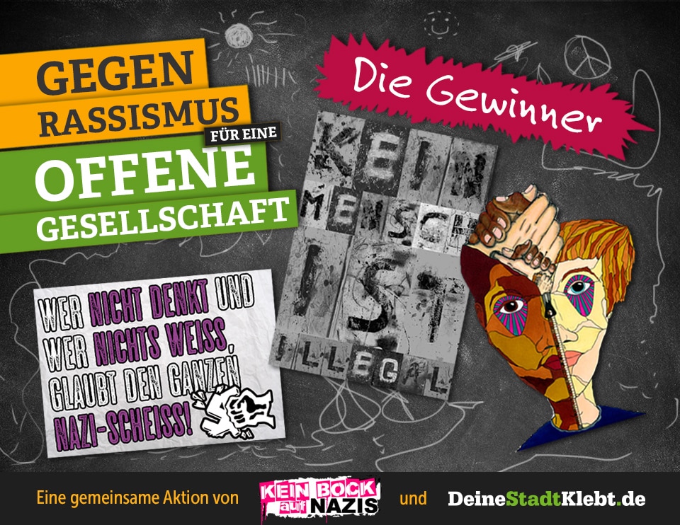 Vor einem Monat haben wir euch gemeinsam mit Kein Bock auf Nazis aufgefordert, im Rahmen des DeineStadtKlebt.de Sticker Contest uns eure Motive GEGEN RASSISMUS und für eine OFFENE GESELLSCHAFT zu schicken. Wir freuen uns sehr, dass so viele von euch sich die Zeit genommen haben und kreativ geworden sind. Und noch mehr freuen wir uns, heute die drei Gewinner präsentieren zu dürfen!